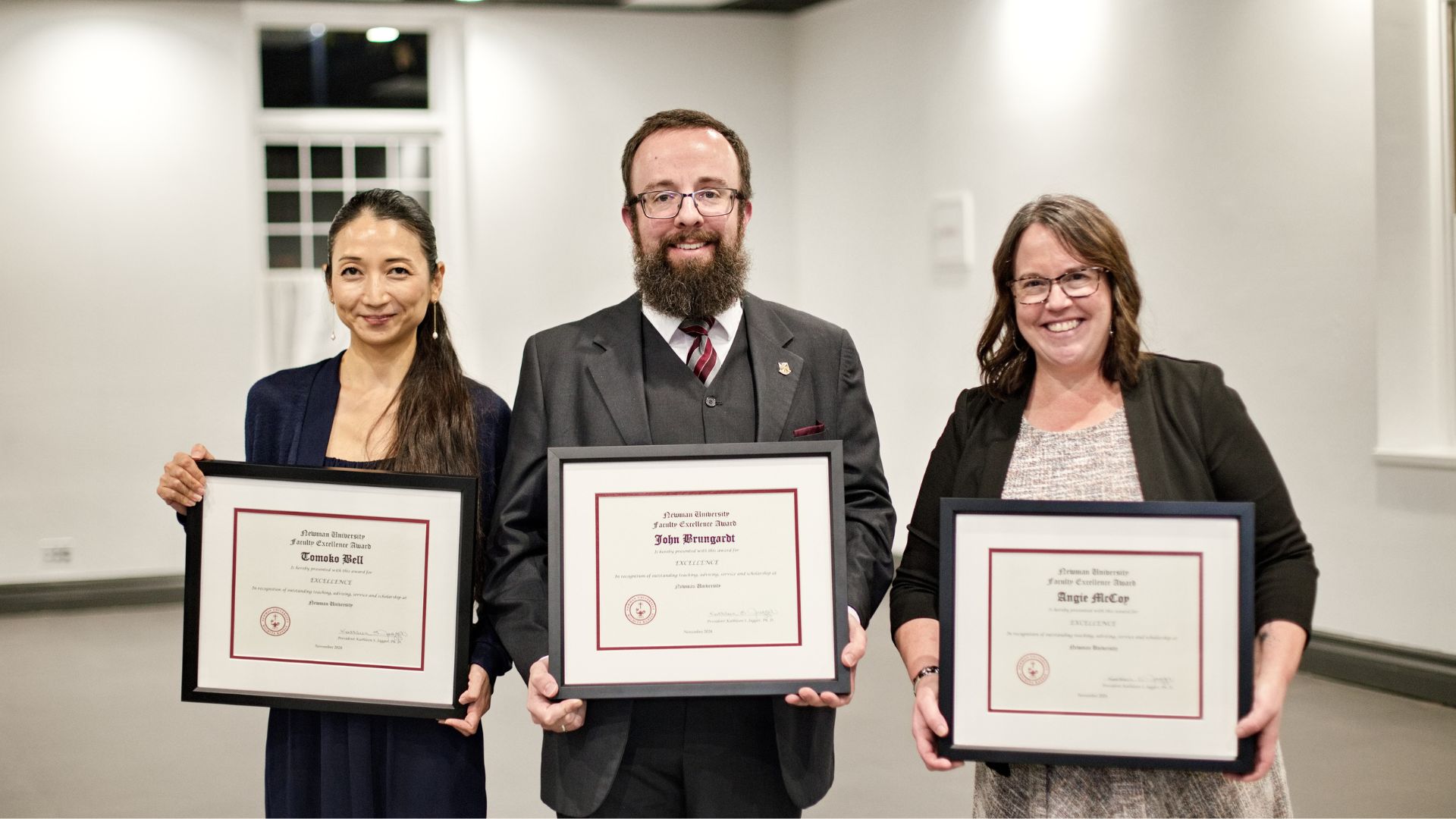 1 (From left to right) Professors Tomoko Bell, John Brungardt and McCoy with their faculty excellence awards