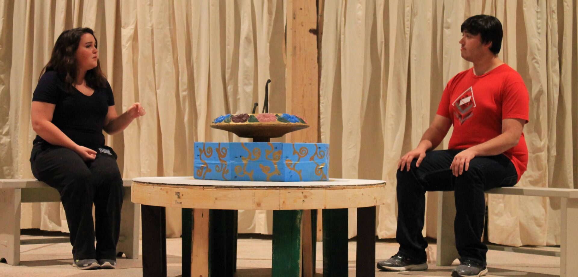 Sophomore Taylore Rose and junior Jacob Hobbie rehearse a scene from Triumph of Love.