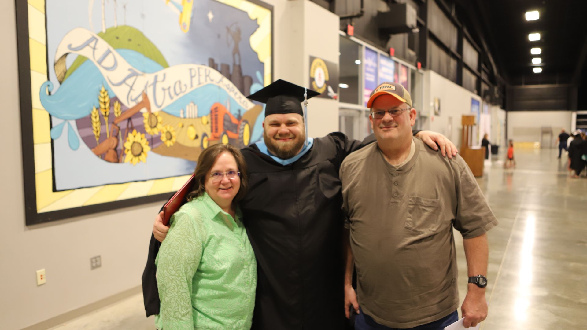Rydman with his parents following his graduation ceremony in May 2024 from Newman University.
