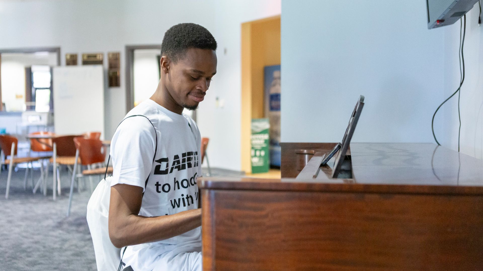 Lotsu-Morgan plays piano in the Student Activities Center in between classes at Newman.