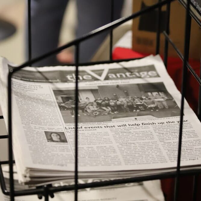 Vantage newspapers in a rack on campus