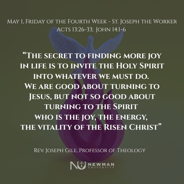 The secret to finding more joy in life is to invite the Holy Spirit into whatever we must do. We are good about turning to Jesus, but not so good about turning to the Spirit who is the joy, the energy, the vitality of the Risen Christ; so, turning to him throughout our day; noticing when he shows up, relishing his presence, thanking him and asking for an even greater share of the Spirit. Doing so will bring joy and delight in all we do, which will open us up even more to the Spirit, which will generate more joy, more delight, even in the midst of our daily tasks.