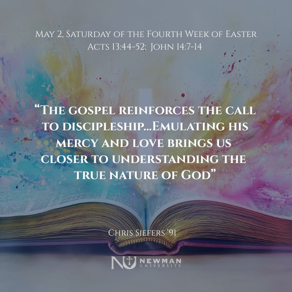 Today’s readings invite us to be a “light to the Gentiles” and a beacon to others. Even though Paul and Barnabas were expelled after preaching the gospel, they did not despair. They simply shook the dust from their feet and moved on. Even when faced with doubters and naysayers, we should continue to find joy in sharing the word of God. The gospel reinforces the call to discipleship. Jesus tells Phillip, “anyone who has seen me has seen the Father.” Jesus provides us with a path to the Father through his words and actions. Emulating his mercy and love brings us closer to understanding the true nature of God.