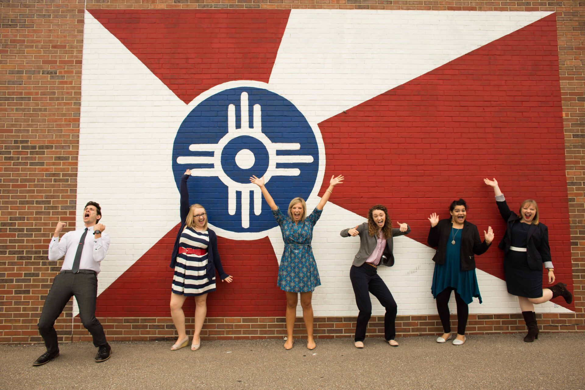 Freshman-Admissions-Counselors-6 Newman University Admissions Counselors pose in front a Wichita Flag mural in downtown.