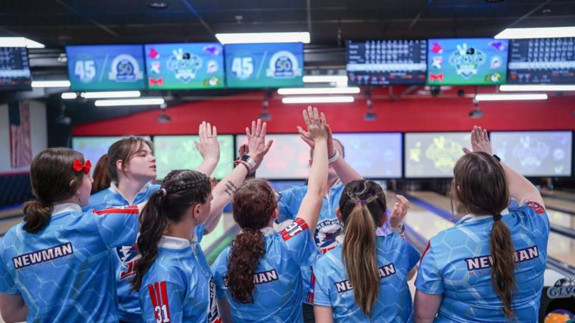 Bowling Newman women's bowling give high fives after achieving runners up status at the GLVC Championships.